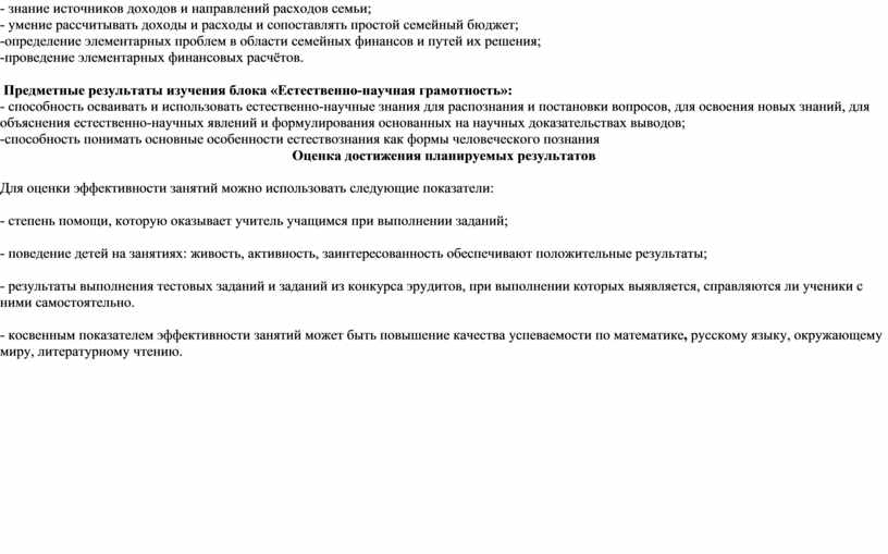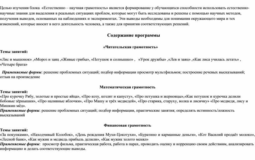 Программа разбита на четыре блока: «Математическая грамотность», «Читательская грамотность», «Естественно – научная грамотность», «Финансовая грамотность»
