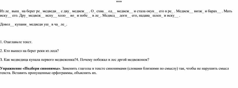 Упражнение «Подбери синонимы». Заменить глаголы в тексте синонимами (словами близкими по смыслу) так, чтобы не нарушить смысл текста. Вставить пропущенные орфограммы, объяснить их.