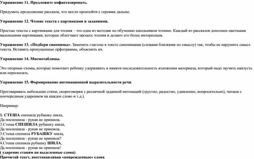 Упражнение 4. Чтение строчек наоборот по буквам. Написанное прочитывается справа налево так, что каждое слово, начиная с последнего, озвучивается по буквам в обратном порядке. Это упражнение развивает способность строгого побуквенного анализа каждого слова, создает в речедвигательной системе установку на непривычные, неожиданные сочетания звуков и тормозит "всплывание" привычных штампов, формирует произвольность регуляции движений глаз, а также создает предпосылки для устранения достаточно распространенных ошибок "зеркального" чтения.