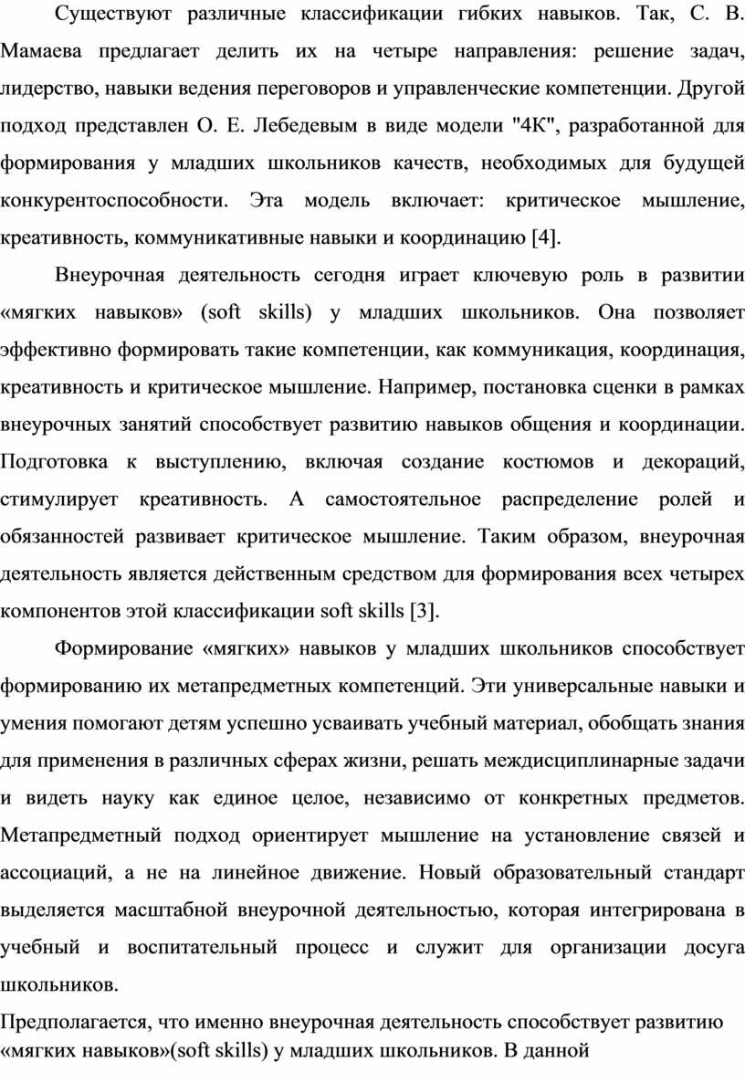 Внеурочная деятельность сегодня играет ключевую роль в развитии «мягких навыков» (soft skills) у младших школьников. Она позволяет эффективно формировать такие компетенции, как коммуникация, координация, креативность и критическое мышление. Например, постановка сценки в рамках внеурочных занятий способствует развитию навыков общения и координации. Подготовка к выступлению, включая создание костюмов и декораций, стимулирует креативность. А самостоятельное распределение ролей и обязанностей развивает критическое мышление. Таким образом, внеурочная деятельность является действенным средством для формирования всех четырех компонентов этой классификации soft skills [3].