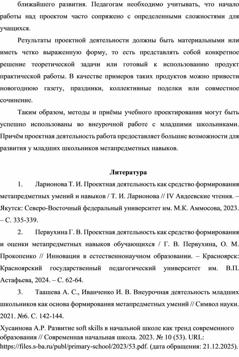 4. Хусаинова А.Р. Развитие soft skills в начальной школе как тренд современного образования // Современная начальная школа. 2023. № 10 (53). URL: https://files.s-ba.ru/publ/primary-school/2023/53.pdf. (дата обращения: 21.12.2025).