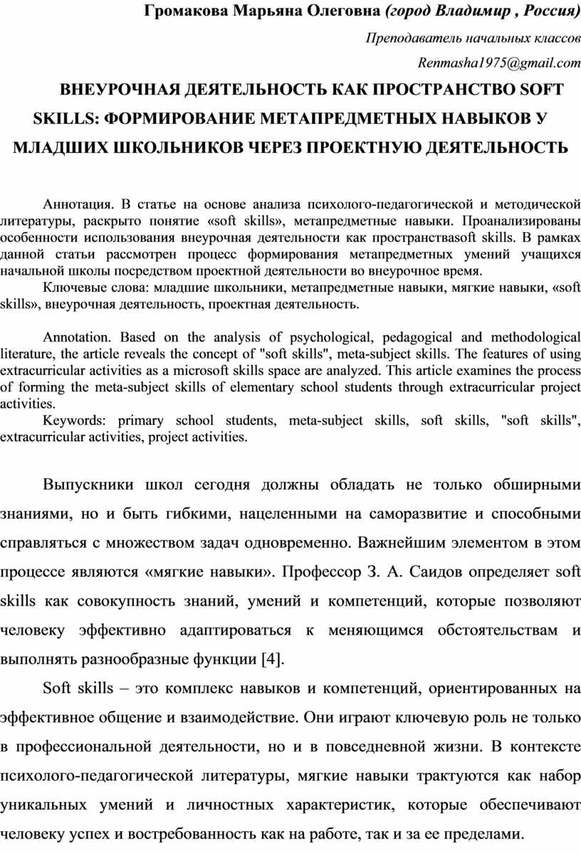 Keywords: primary school students, meta-subject skills, soft skills, "soft skills", extracurricular activities, project activities.