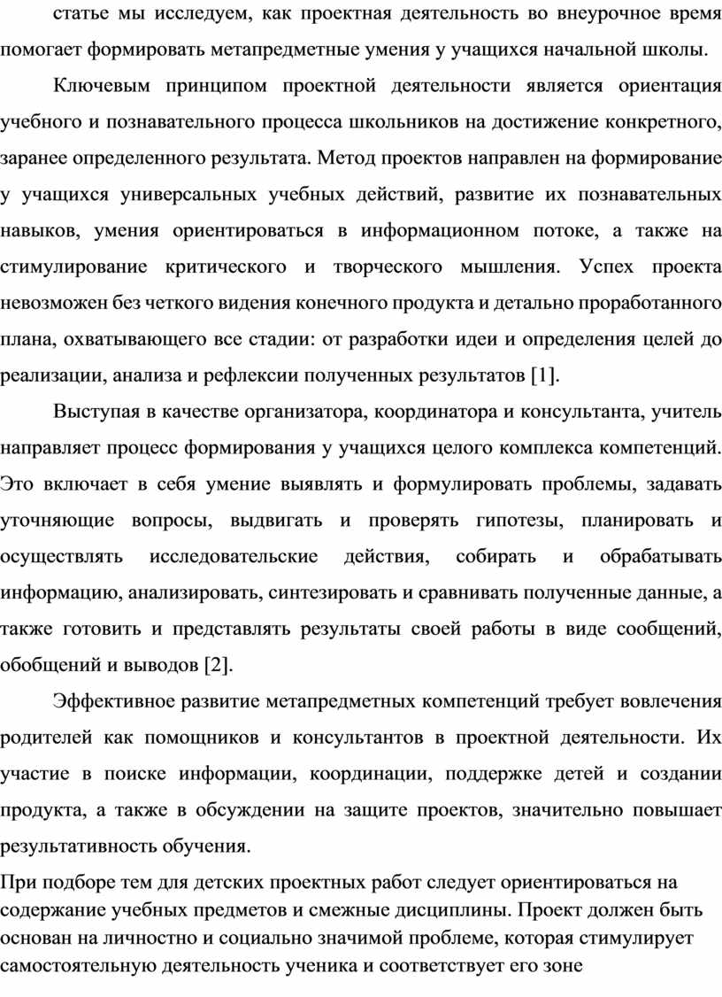 Эффективное развитие метапредметных компетенций требует вовлечения родителей как помощников и консультантов в проектной деятельности. Их участие в поиске информации, координации, поддержке детей и создании продукта, а также в обсуждении на защите проектов, значительно повышает результативность обучения.