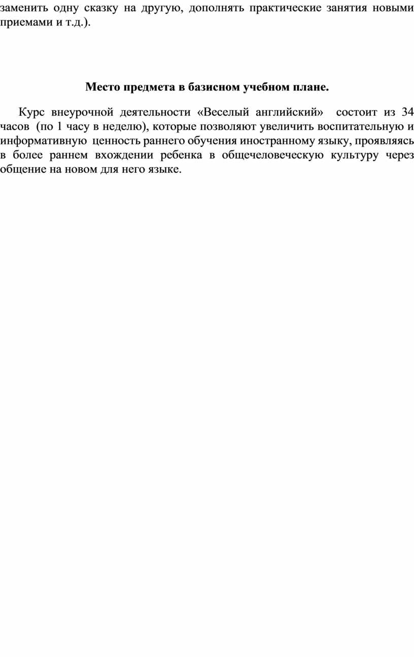 Курс внеурочной деятельности «Веселый английский» состоит из 34 часов (по 1 часу в неделю), которые позволяют увеличить воспитательную и информативную ценность раннего обучения иностранному языку, проявляясь в более раннем вхождении ребенка в общечеловеческую культуру через общение на новом для него языке.