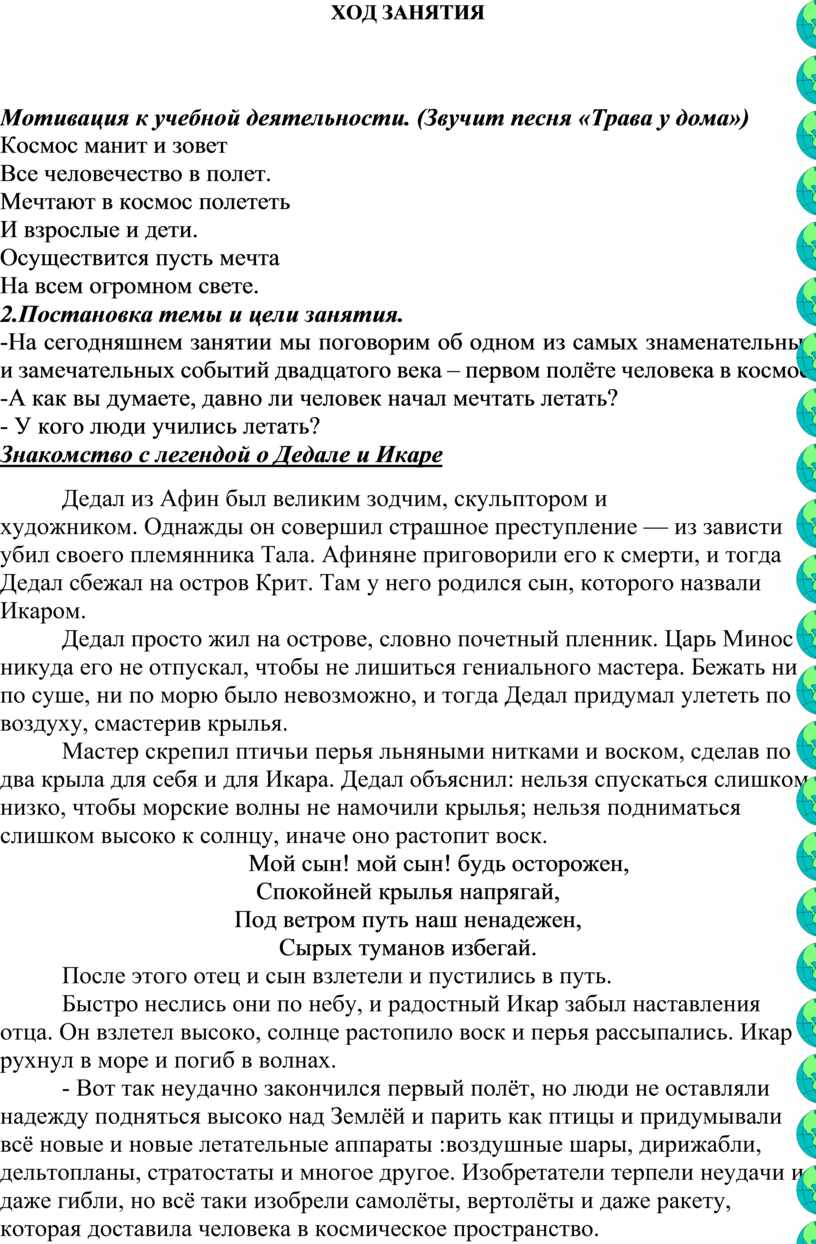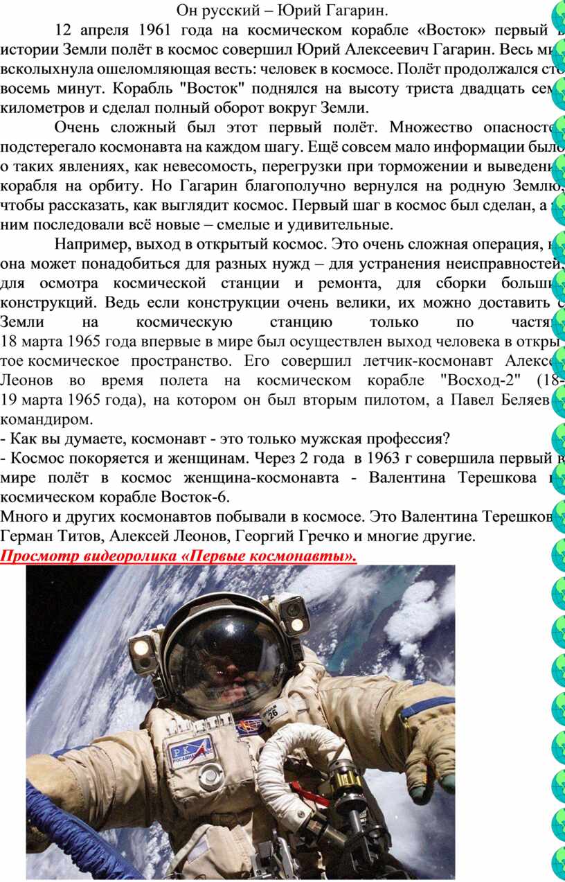 -На сегодняшнем занятии мы поговорим об одном из самых знаменательных и замечательных событий двадцатого века – первом полёте человека в космос.