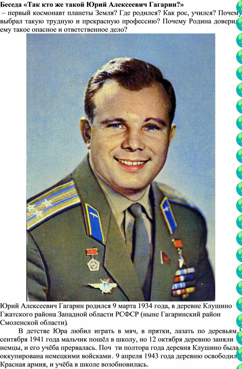 – первый космонавт планеты Земля? Где родился? Как рос, учился? Почему выбрал такую трудную и прекрасную профессию? Почему Родина доверила ему такое опасное и ответственное дело?