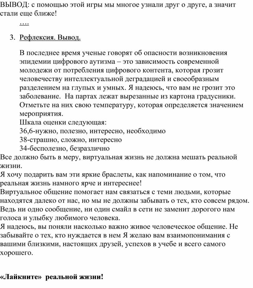 В последнее время ученые говорят об опасности возникновения эпидемии цифрового аутизма – это зависимость современной молодежи от потребления цифрового контента, которая грозит человечеству интеллектуальной деградацией и своеобразным разделением на глупых и умных. Я надеюсь, что вам не грозит это заболевание. На партах лежат вырезанные из картона градусники. Отметьте на них свою температуру, которая определяется значением мероприятия.