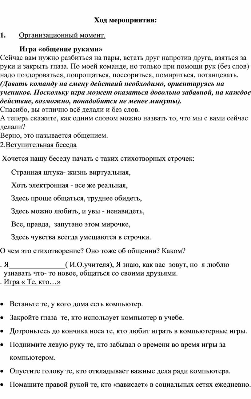 Сейчас вам нужно разбиться на пары, встать друг напротив друга, взяться за руки и закрыть глаза. По моей команде, но только при помощи рук (без слов) надо поздороваться, попрощаться, поссориться, помириться, потанцевать.