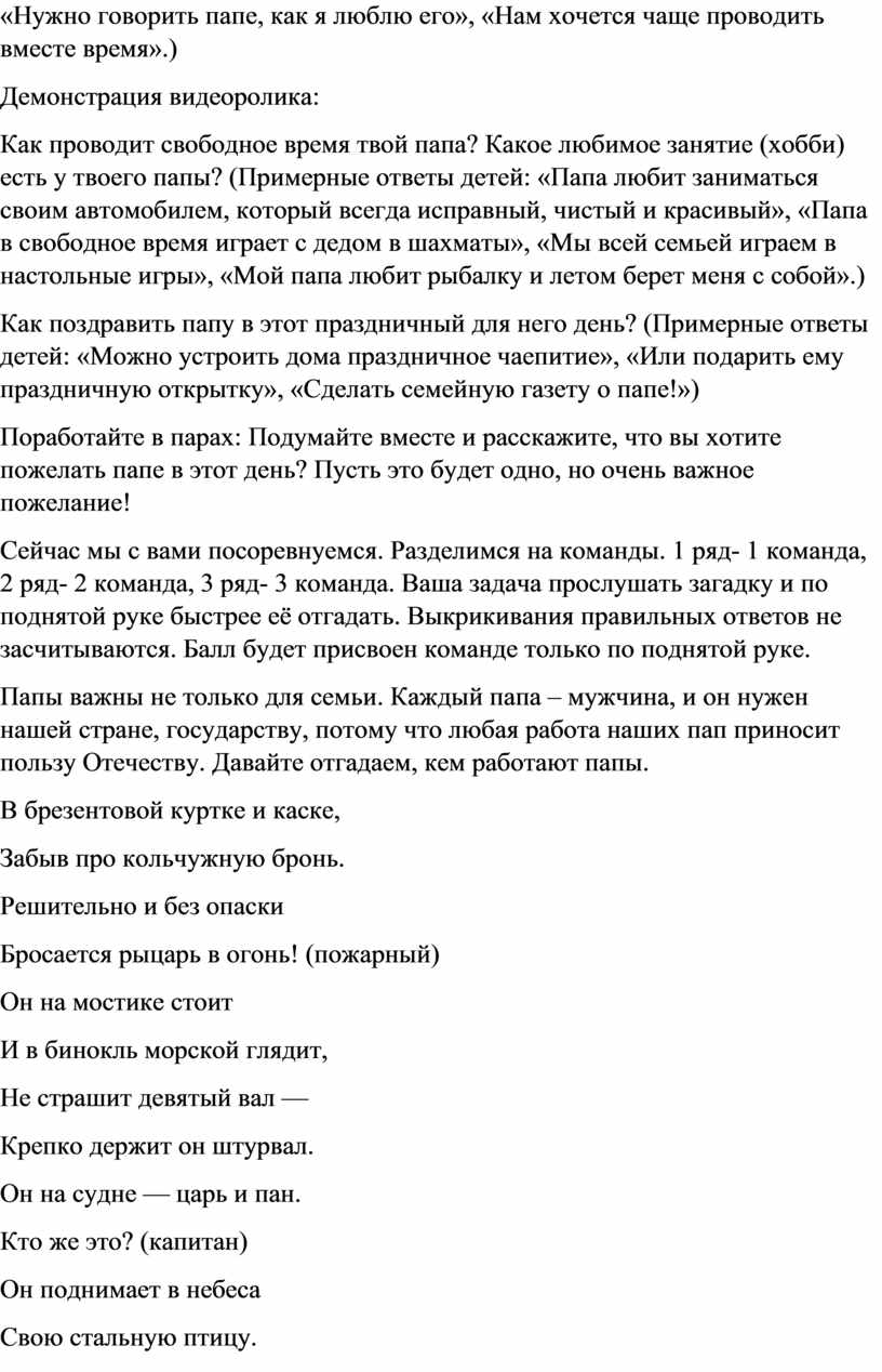 Для чего установлен такой праздник, как вы думаете? (Примерные ответы детей: «Чтобы все знали, что папа – главный человек в семье, как и мама», «Нужно говорить папе, как я люблю его», «Нам хочется чаще проводить вместе время».)