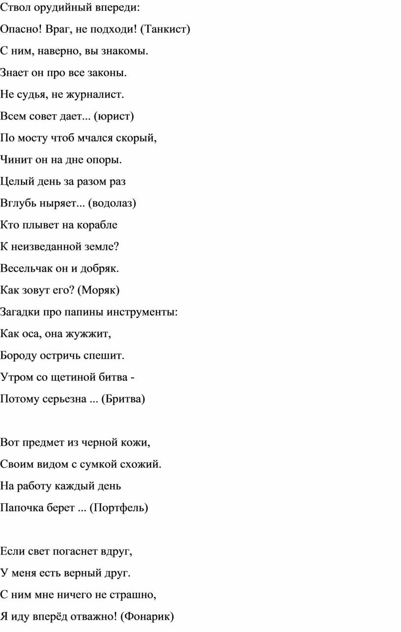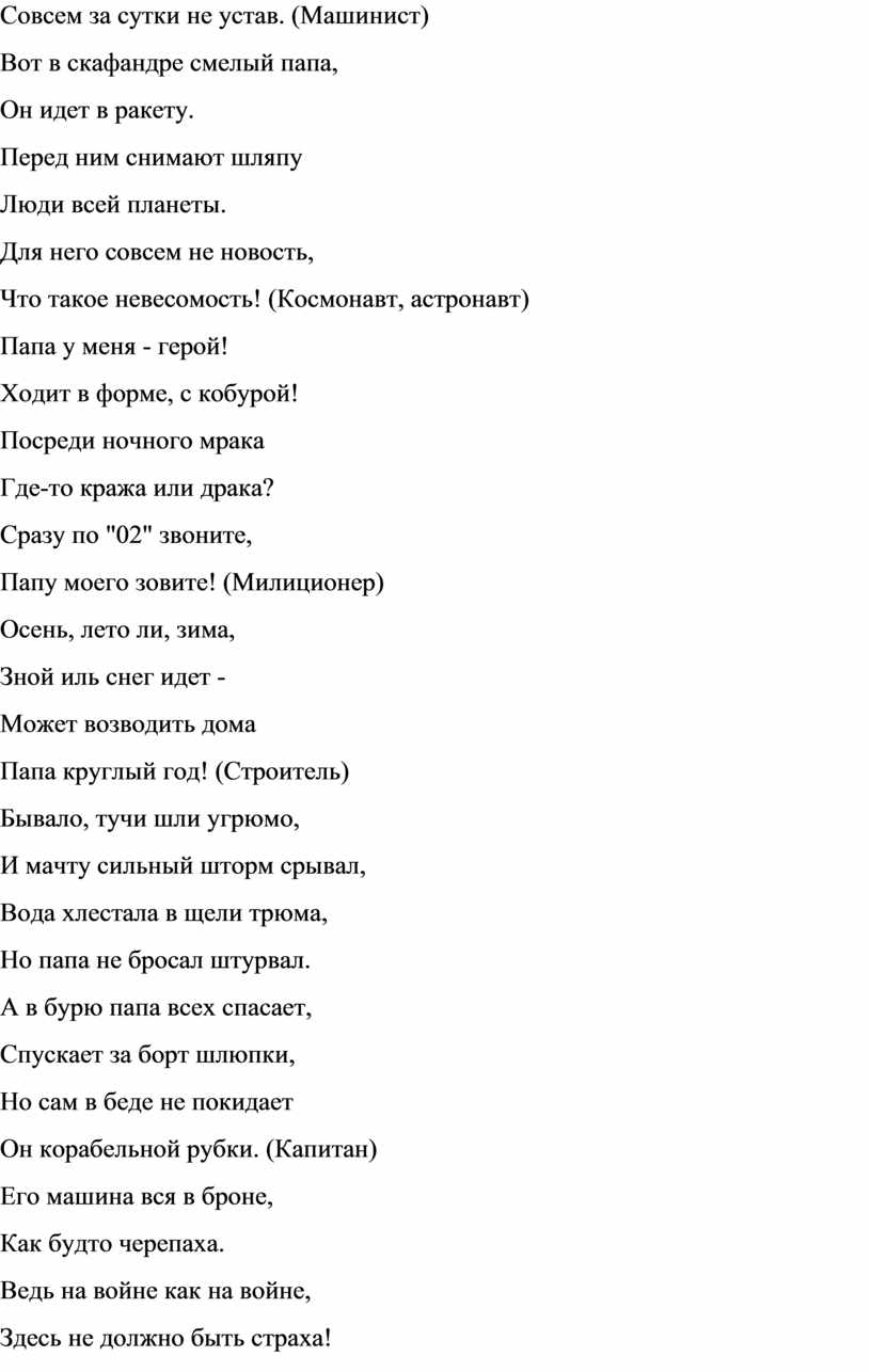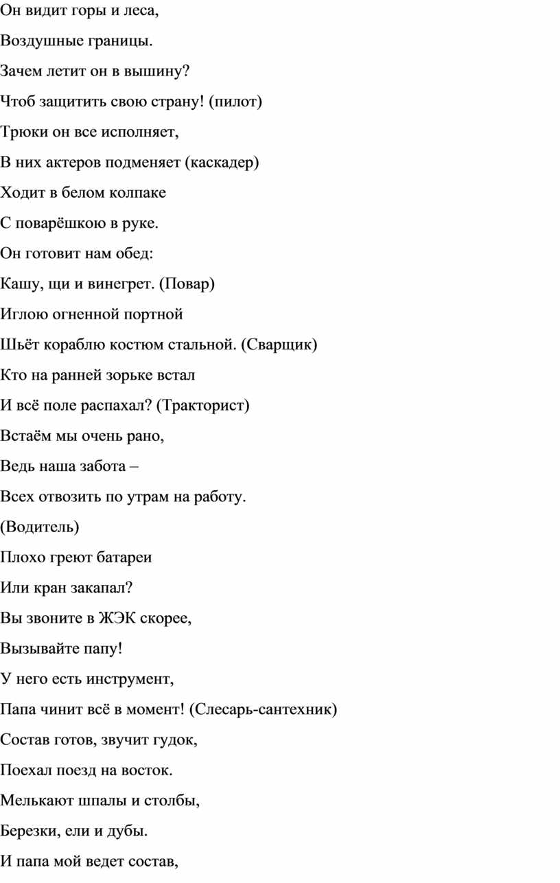 Папы важны не только для семьи. Каждый папа – мужчина, и он нужен нашей стране, государству, потому что любая работа наших пап приносит пользу Отечеству. Давайте отгадаем, кем работают папы.