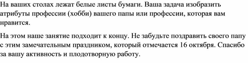 На ваших столах лежат белые листы бумаги. Ваша задача изобразить атрибуты профессии (хобби) вашего папы или профессии, которая вам нравится.