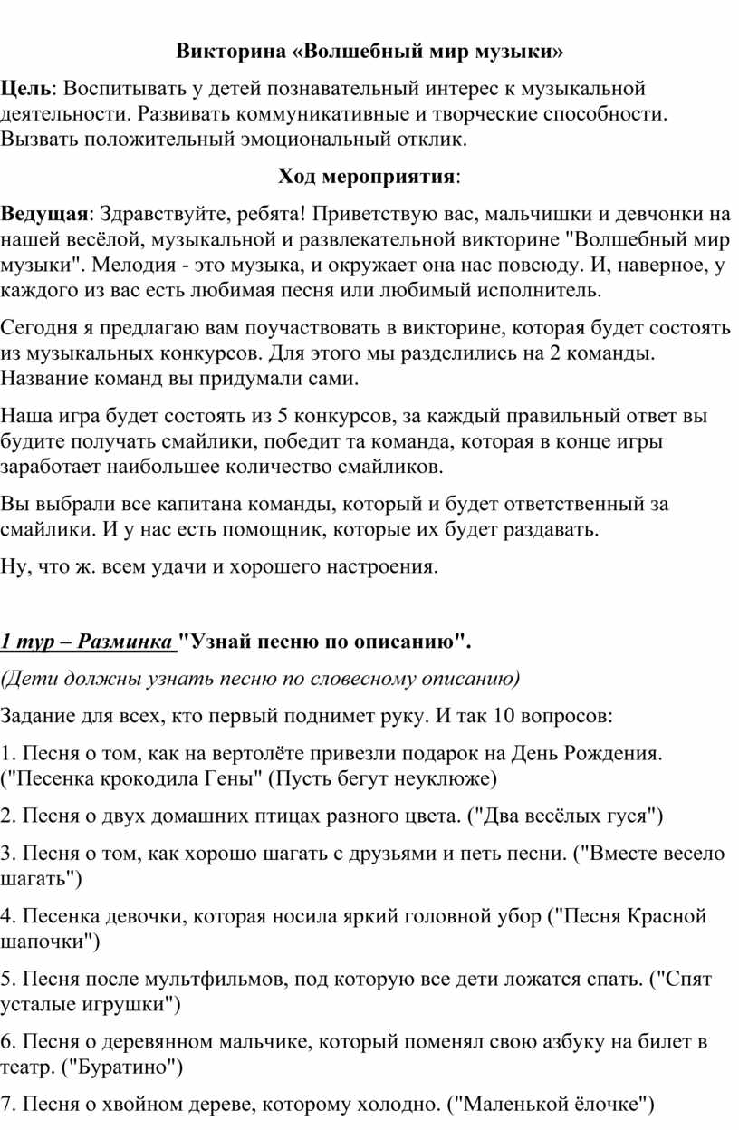 Ведущая: Здравствуйте, ребята! Приветствую вас, мальчишки и девчонки на нашей весёлой, музыкальной и развлекательной викторине "Волшебный мир музыки". Мелодия - это музыка, и окружает она нас повсюду. И, наверное, у каждого из вас есть любимая песня или любимый исполнитель.