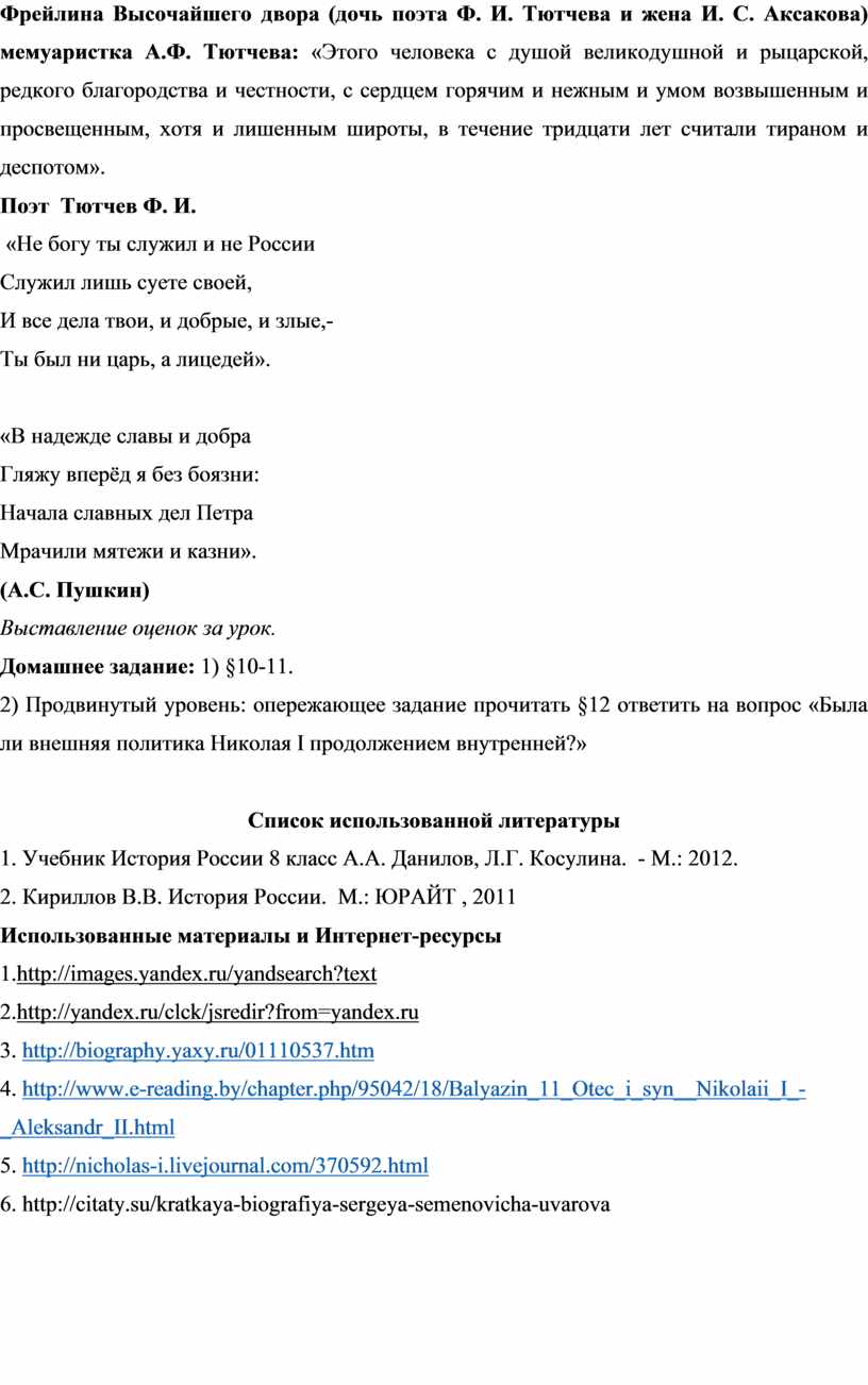 1. Учебник История России 8 класс А.А. Данилов, Л.Г. Косулина. - М.: 2012.