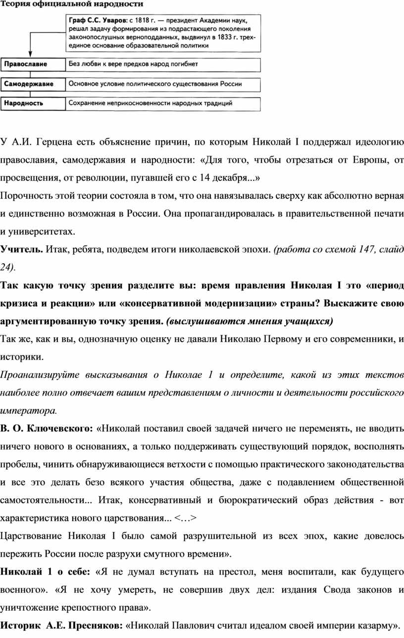 У А.И. Герцена есть объяснение причин, по которым Николай I поддержал идеологию православия, самодержавия и народности: «Для того, чтобы отрезаться от Европы, от просвещения, от революции, пугавшей его с 14 декабря...»
