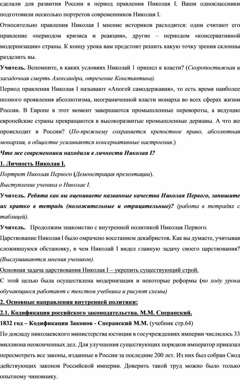 Учитель. Продолжим знакомство с внутренней политикой Николая Первого.