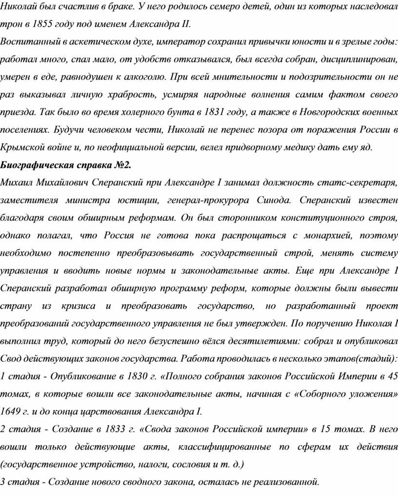 Михаил Михайлович Сперанский при Александре I занимал должность статс-секретаря, заместителя министра юстиции, генерал-прокурора Синода. Сперанский известен благодаря своим обширным реформам. Он был сторонником конституционного строя, однако полагал, что Россия не готова пока распрощаться с монархией, поэтому необходимо постепенно преобразовывать государственный строй, менять систему управления и вводить новые нормы и законодательные акты. Еще при Александре I Сперанский разработал обширную программу реформ, которые должны были вывести страну из кризиса и преобразовать государство, но разработанный проект преобразований государственного управления не был утвержден. По поручению Николая I выполнил труд, который до него безуспешно вёлся десятилетиями: собрал и опубликовал Свод действующих законов государства. Работа проводилась в несколько этапов(стадий):