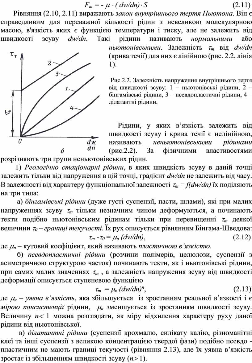 Рідини, у яких в’язкість залежить від швидкості зсуву і крива течії є нелінійною, називають неньютонівськими рідинами (рис.2.2). За фізичними властивостями розрізняють три групи неньютонівських рідин.