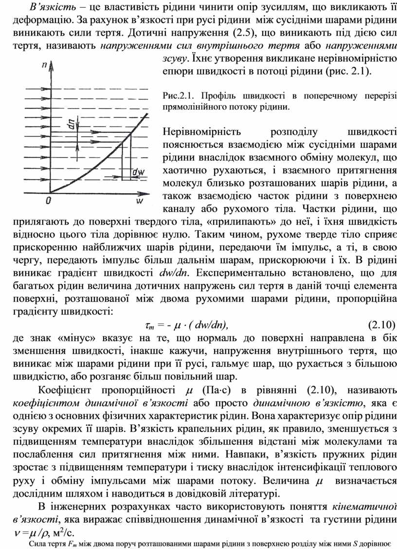 Коефіцієнт пропорційності m (Па×с) в рівнянні (2.10), називають коефіцієнтом динамічної в’язкості або просто динамічною в’язкістю, яка є однією з основних фізичних характеристик рідин. Вона характеризує опір рідини зсуву окремих її шарів. В’язкість крапельних рідин, як правило, зменшується з підвищенням температури внаслідок збільшення відстані між молекулами та послаблення сил притягнення між ними. Навпаки, в’язкість пружних рідин зростає з підвищенням температури і тиску внаслідок інтенсифікації теплового руху і обміну імпульсами між шарами потоку. Величина m визначається дослідним шляхом і наводиться в довідковій літературі.