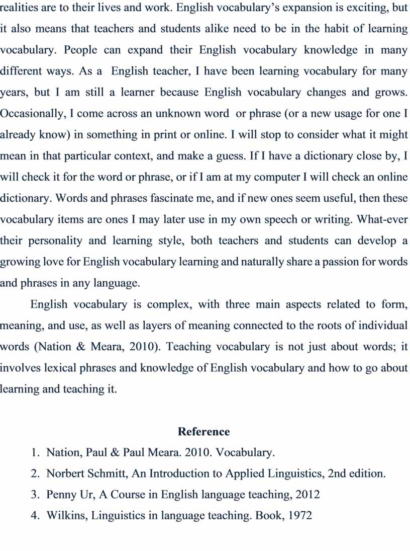 As Ur (2012) aptly stated, unlike grammar, “lexical items … are an open set, constantly being added to (and lost, as archaic words gradually go out of use)” (p.3). Perhaps this situation is most evident with computer-related vocabulary, such as the Internet, e-mail, and Web browser, which was not commonly used even 15 years ago. Now, though, everyone seems to know these items and how important such realities are to their lives and work. English vocabulary’s expansion is exciting, but it also means that teachers and students alike need to be in the habit of learning vocabulary. People can expand their English vocabulary knowledge in many different ways. As a English teacher, I have been learning vocabulary for many years, but I am still a learner because English vocabulary changes and grows. Occasionally, I come across an unknown word or phrase (or a new usage for one I already know) in something in print or online. I will stop to consider what it might mean in that particular context, and make a guess. If I have a dictionary close by, I will check it for the word or phrase, or if I am at my computer I will check an online dictionary. Words and phrases fascinate me, and if new ones seem useful, then these vocabulary items are ones I may later use in my own speech or writing. What-ever their personality and learning style, both teachers and students can develop a growing love for English vocabulary learning and naturally share a passion for words and phrases in any language.