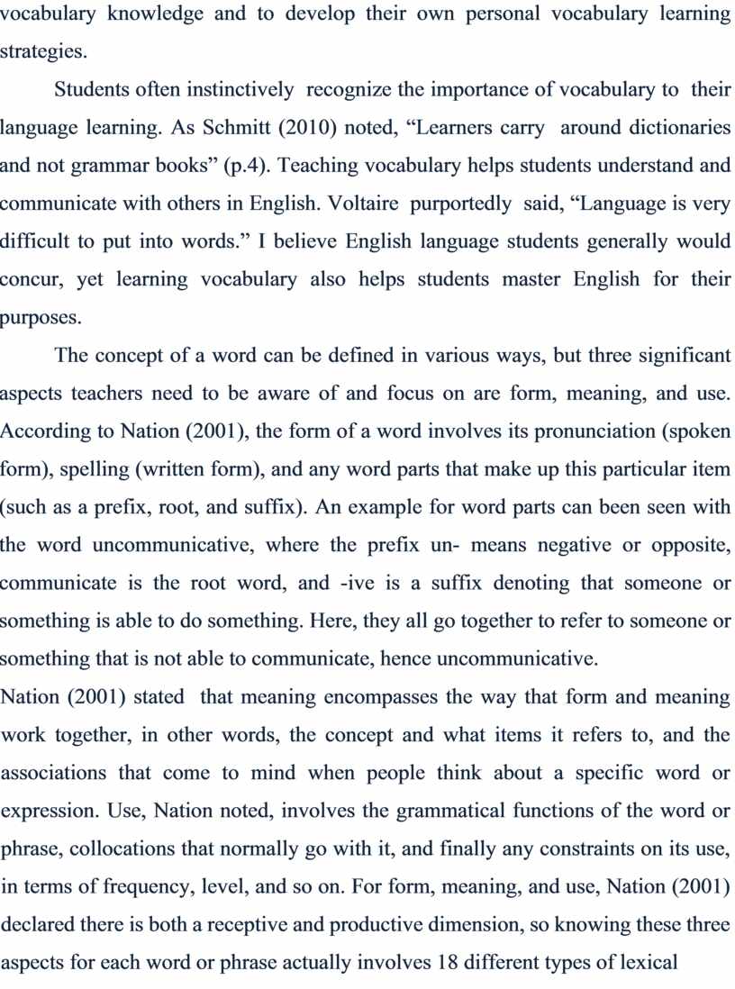 The concept of a word can be defined in various ways, but three significant aspects teachers need to be aware of and focus on are form, meaning, and use. According to Nation (2001), the form of a word involves its pronunciation (spoken form), spelling (written form), and any word parts that make up this particular item (such as a prefix, root, and suffix). An example for word parts can been seen with the word uncommunicative, where the prefix un- means negative or opposite, communicate is the root word, and -ive is a suffix denoting that someone or something is able to do something. Here, they all go together to refer to someone or something that is not able to communicate, hence uncommunicative.