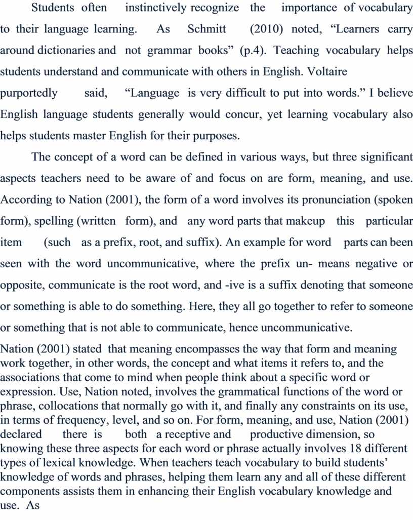 The concept of a word can be defined in various ways, but three significant aspects teachers need to be aware of and focus on are form, meaning, and use. According to Nation (2001), the form of a word involves its pronunciation (spoken form), spelling (written form), and any word parts that make up this particular item (such as a prefix, root, and suffix). An example for word parts can been seen with the word uncommunicative, where the prefix un- means negative or opposite, communicate is the root word, and -ive is a suffix denoting that someone or something is able to do something. Here, they all go together to refer to someone or something that is not able to communicate, hence uncommunicative.