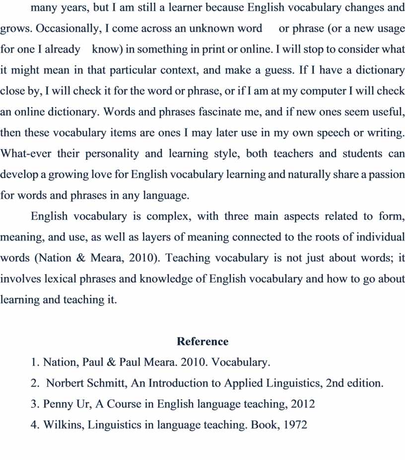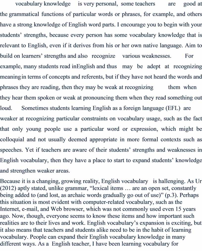 Because it is a changing, growing reality, English vocabulary is hallenging. As Ur (2012) aptly stated, unlike grammar, “lexical items … are an open set, constantly being added to (and lost, as archaic words gradually go out of use)” (p.3). Perhaps this situation is most evident with computer-related vocabulary, such as the Internet, e-mail, and Web browser, which was not commonly used even 15 years ago. Now, though, everyone seems to know these items and how important such realities are to their lives and work. English vocabulary’s expansion is exciting, but it also means that teachers and students alike need to be in the habit of learning vocabulary. People can expand their English vocabulary knowledge in many different ways. As a English teacher, I have been learning vocabulary for many years, but I am still a learner because English vocabulary changes and grows. Occasionally, I come across an unknown word or phrase (or a new usage for one I already know) in something in print or online. I will stop to consider what it might mean in that particular context, and make a guess. If I have a dictionary close by, I will check it for the word or phrase, or if I am at my computer I will check an online dictionary. Words and phrases fascinate me, and if new ones seem useful, then these vocabulary items are ones I may later use in my own speech or writing. What-ever their personality and learning style, both teachers and students can develop a growing love for English vocabulary learning and naturally share a passion for words and phrases in any language.