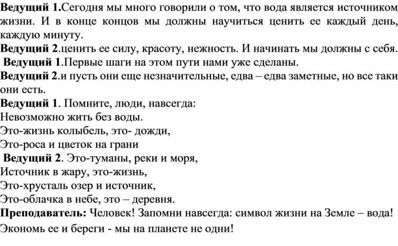 Ведущий 1.Сегодня мы много говорили о том, что вода является источником жизни. И в конце концов мы должны научиться ценить ее каждый день, каждую минуту.