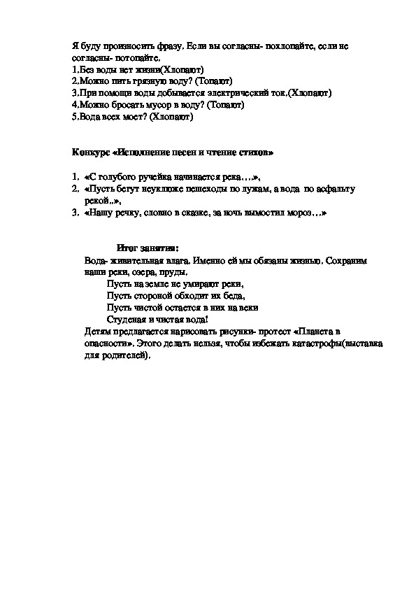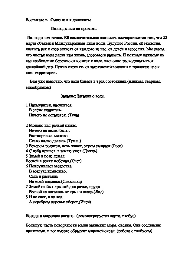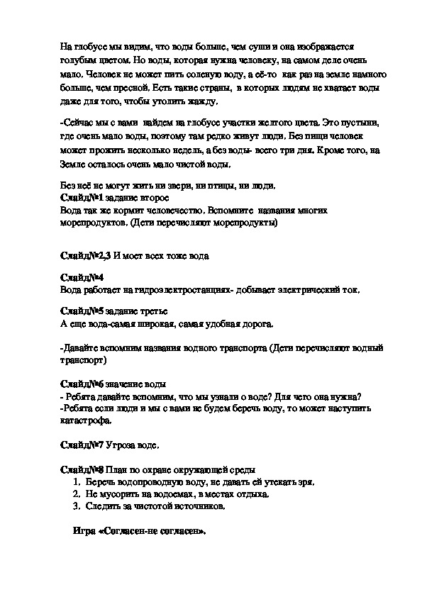 Конспект занятия для детей старшего дошкольного возраста "Вода это жизнь". Основной целью занятия является: расширение знаний детей о значении воды в нашей жизни и экологических проблемах. В ходе занятия дети проводят эксперименты с водой, составили план по охране окружающей среды.Конспект занятия "Вода это жизнь"