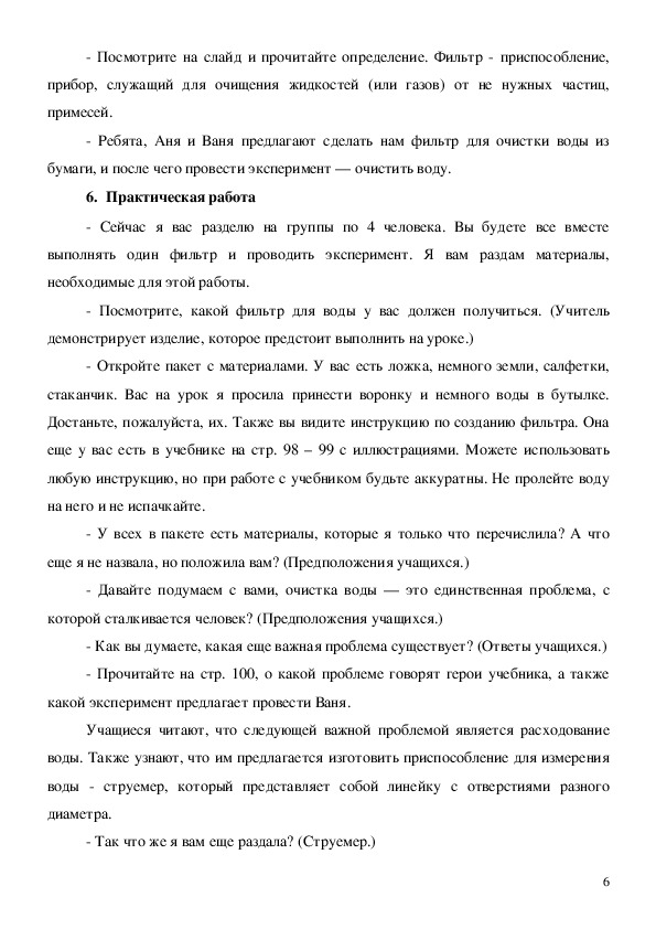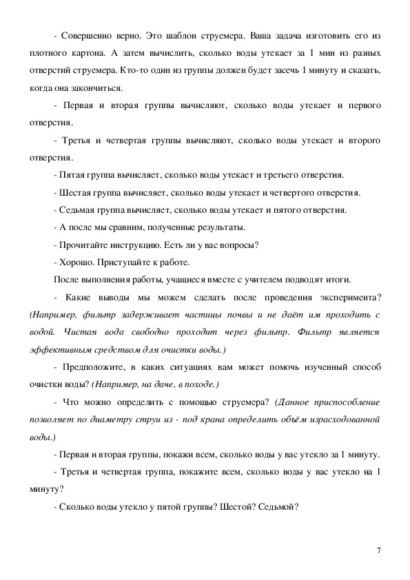 эксперимент по очистке воды, составлять отчёт на основе наблюдений; исследоватьколичество воды, которое расходует человек за 1 минуту при разном напоре водяной