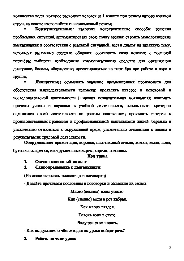 - Предметные: освоить основные понятия (водоканал, фильтрация, дезинфекция, резервуар, струемер, фильтр, ультрафиолетовые лучи); составлять рассказ о водоснабжении города; понимать важность существования воды в нашей жизни; называть способы очистки воды и способы экономного расходования воды; выполнять простейший фильтр из бумаги и пользоваться им; знать варианты применения воды; осознавать важность экономного расходования воды; проводить эксперимент по определению количества расходуемой воды при помощи струемера;