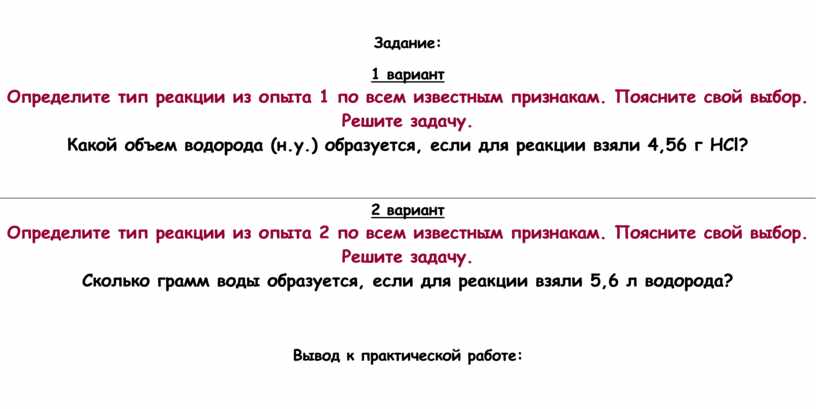 1 вариант Определите тип реакции из опыта 1 по всем известным признакам. Поясните свой выбор. Решите задачу. Какой объем водорода (н.у.) образуется, если для реакции взяли 4,56 г HCl?