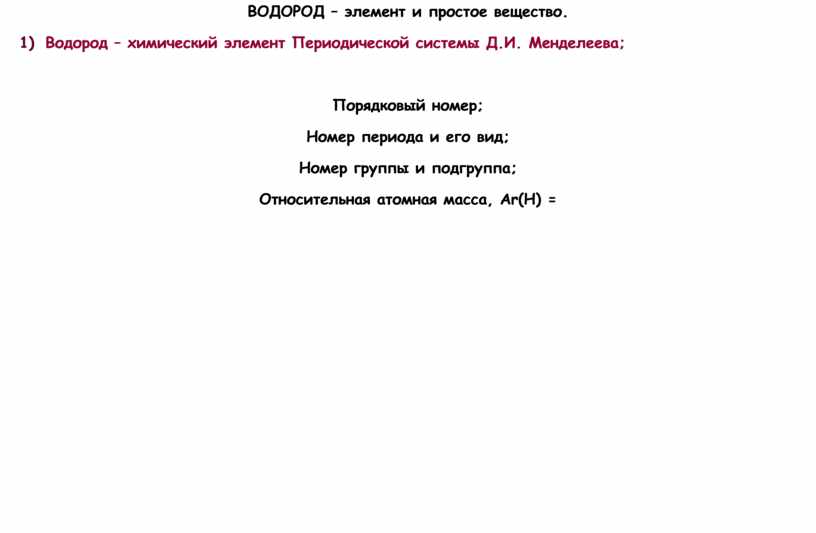 1) Водород – химический элемент Периодической системы Д.И. Менделеева;