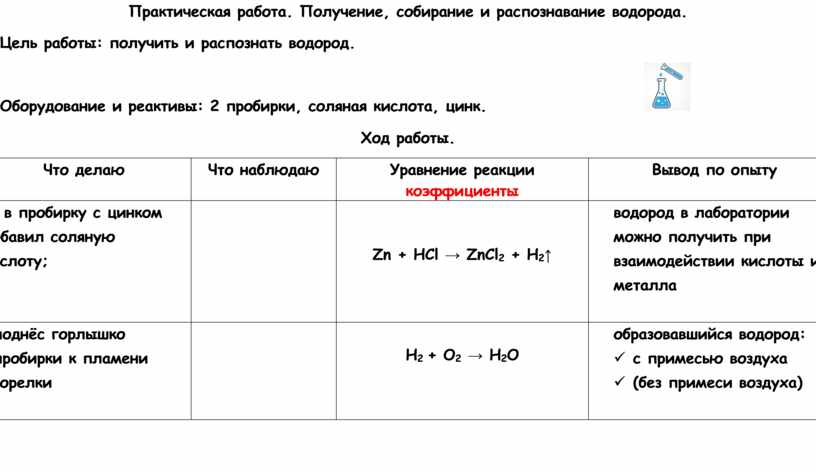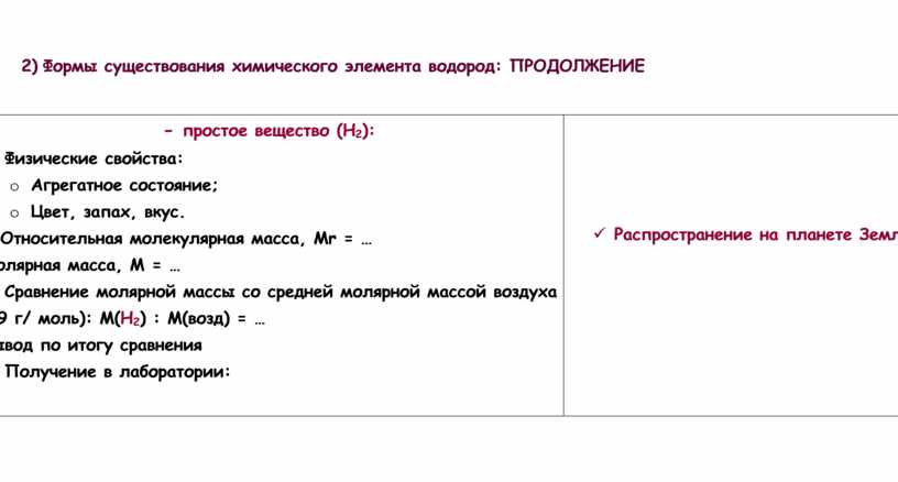 - простое вещество (H2): 1) Физические свойства: o Агрегатное состояние; o Цвет, запах, вкус. 2) Относительная молекулярная масса, Mr = … Молярная масса, M = … 3) Сравнение молярной массы со средней молярной массой воздуха (29 г/ моль): М(H2) : М(возд) = … Вывод по итогу сравнения 4) Получение в лаборатории: