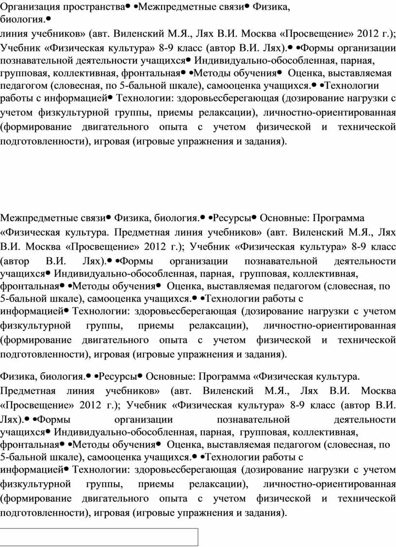 Основные: Программа «Физическая культура. Предметная линия учебников» (авт. Виленский М.Я., Лях В.И. Москва «Просвещение» 2012 г.); Учебник «Физическая культура» 8-9 класс (автор В.И. Лях). |