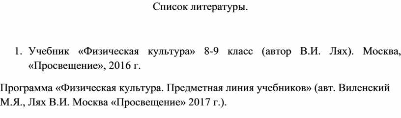 1. Учебник «Физическая культура» 8-9 класс (автор В.И. Лях). Москва, «Просвещение», 2016 г.