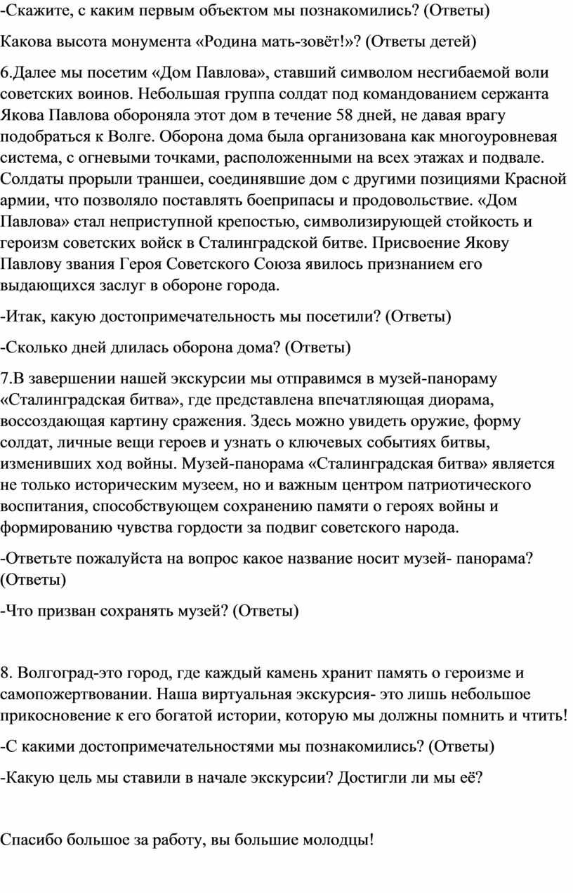 2.Как вы думаете почему город Волгоград является городом-героем? (Ответы детей) Хорошо. Раньше город Волгоград, назывался Сталинград. И битву за этот город назвали Сталинградской. Шли ожесточенные бои за освобождение города. На данный момент в городе установлено множество объектов, связанных с героической обороной города в годы Великой Отечественной войны. Скажите, что мы можем узнать на нашей экскурсии? (Ответы детей)