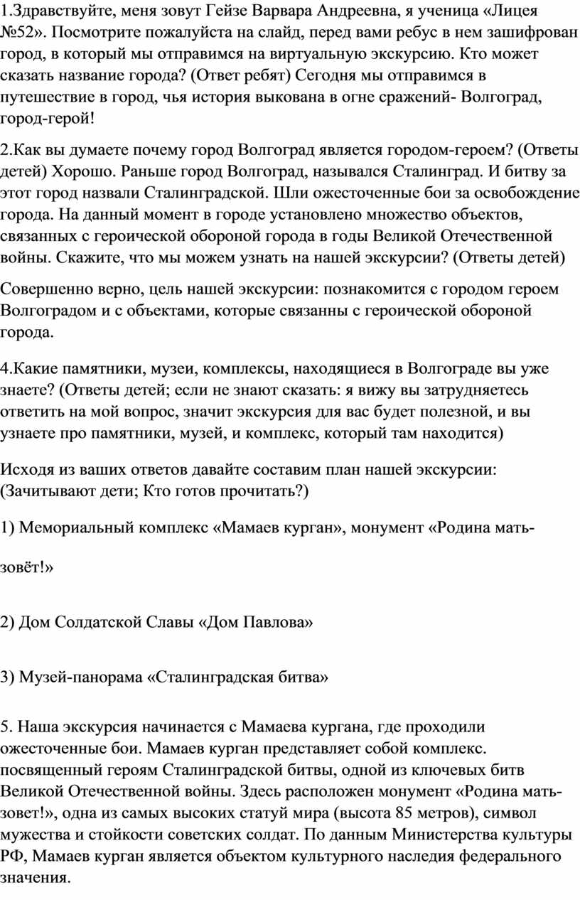 1.Здравствуйте, меня зовут Гейзе Варвара Андреевна, я ученица «Лицея №52». Посмотрите пожалуйста на слайд, перед вами ребус в нем зашифрован город, в который мы отправимся на виртуальную экскурсию. Кто может сказать название города? (Ответ ребят) Сегодня мы отправимся в путешествие в город, чья история выкована в огне сражений- Волгоград, город-герой!