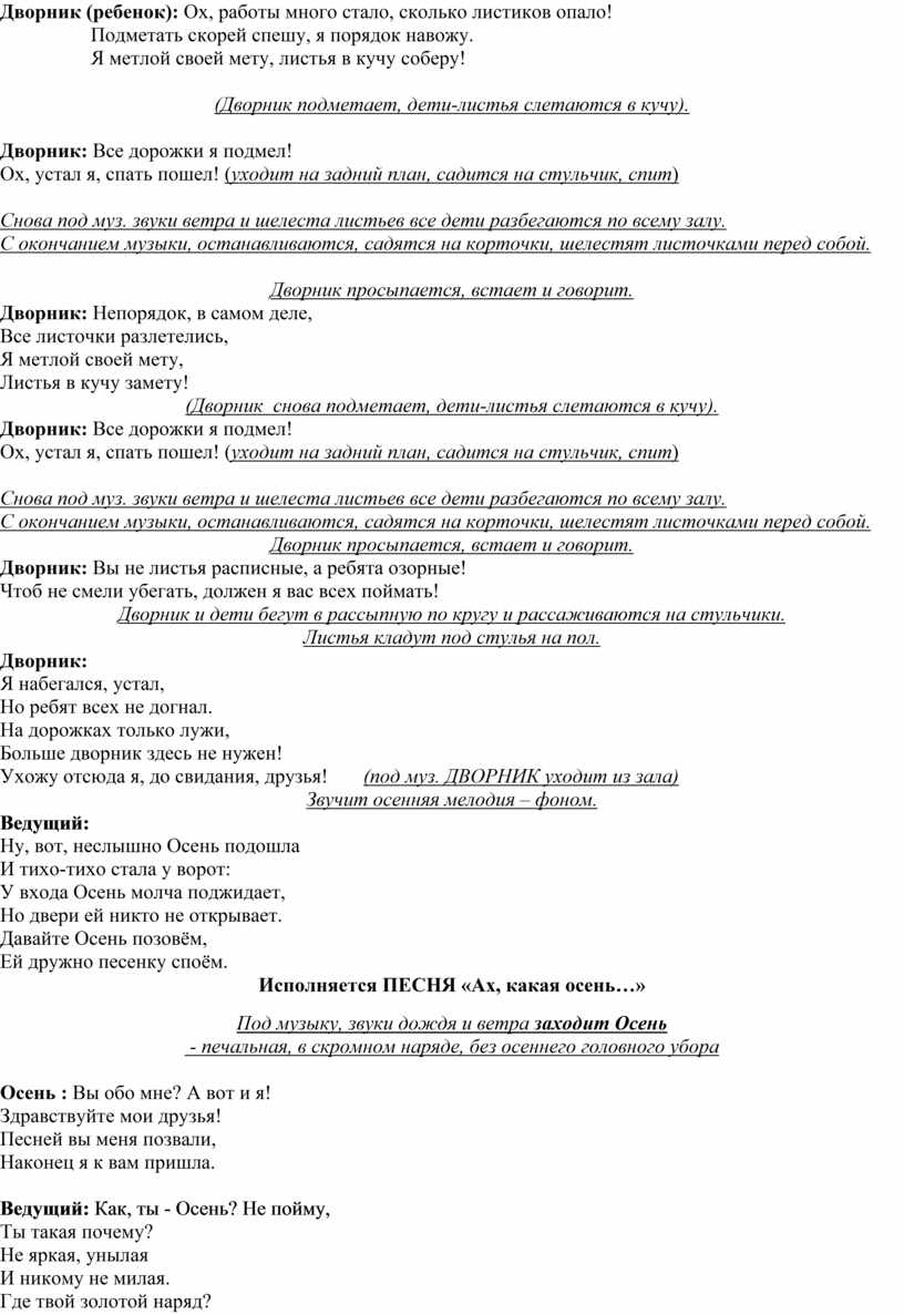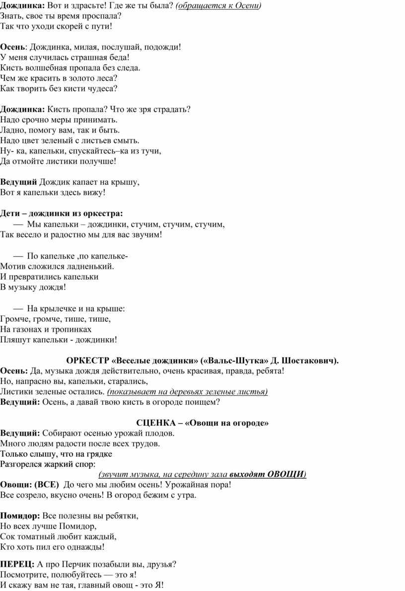 Дети герои: Дворник; Дождинки, муз. оркестр;, Овощи - помидор, перец, капуста, горошки (2), лук, свекла, морковь (2), картошка.