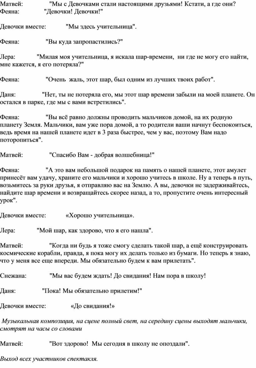 Феяна: "А это вам небольшой подарок на память о нашей планете, этот амулет принесёт вам удачу, храните его мальчики и хорошо учитесь в школе. Ну а теперь в путь, возьмитесь за руки друзья, я отправляю вас на Землю. А вы, девочки не задерживайтесь, найдите шар времени и возвращайтесь скорее назад, а то, пропустите очень интересный урок".