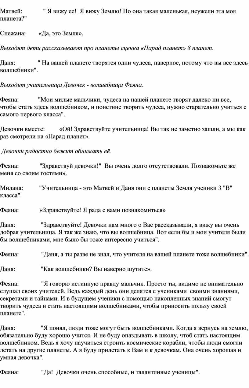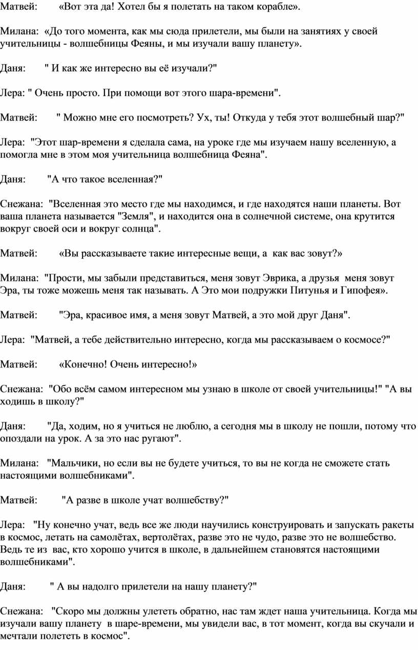 Снежана: «Мальчики! Наша учительница волшебница Феяна разрешила пригласить вас к нам на урок на нашу планету, вы бы хотели полететь с нами».