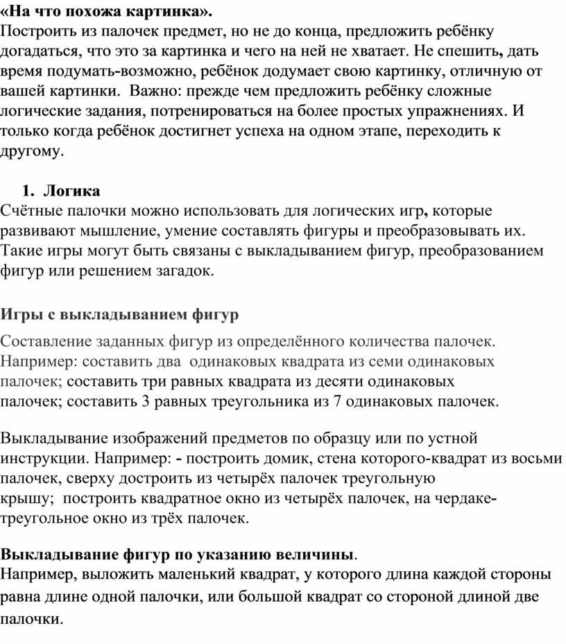 Построить из палочек предмет, но не до конца, предложить ребёнку догадаться, что это за картинка и чего на ней не хватает. Не спешить, дать время подумать-возможно, ребёнок додумает свою картинку, отличную от вашей картинки. Важно: прежде чем предложить ребёнку сложные логические задания, потренироваться на более простых упражнениях. И только когда ребёнок достигнет успеха на одном этапе, переходить к другому.