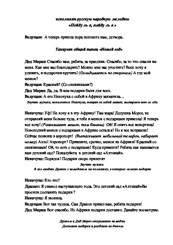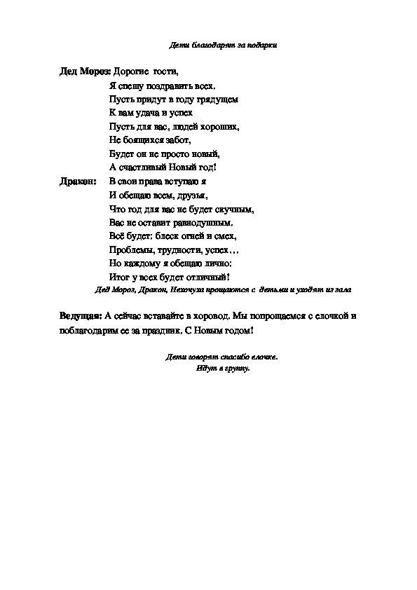 Дед Мороз, Дракон, Нехочуха прощаются с детьми и уходят из зала