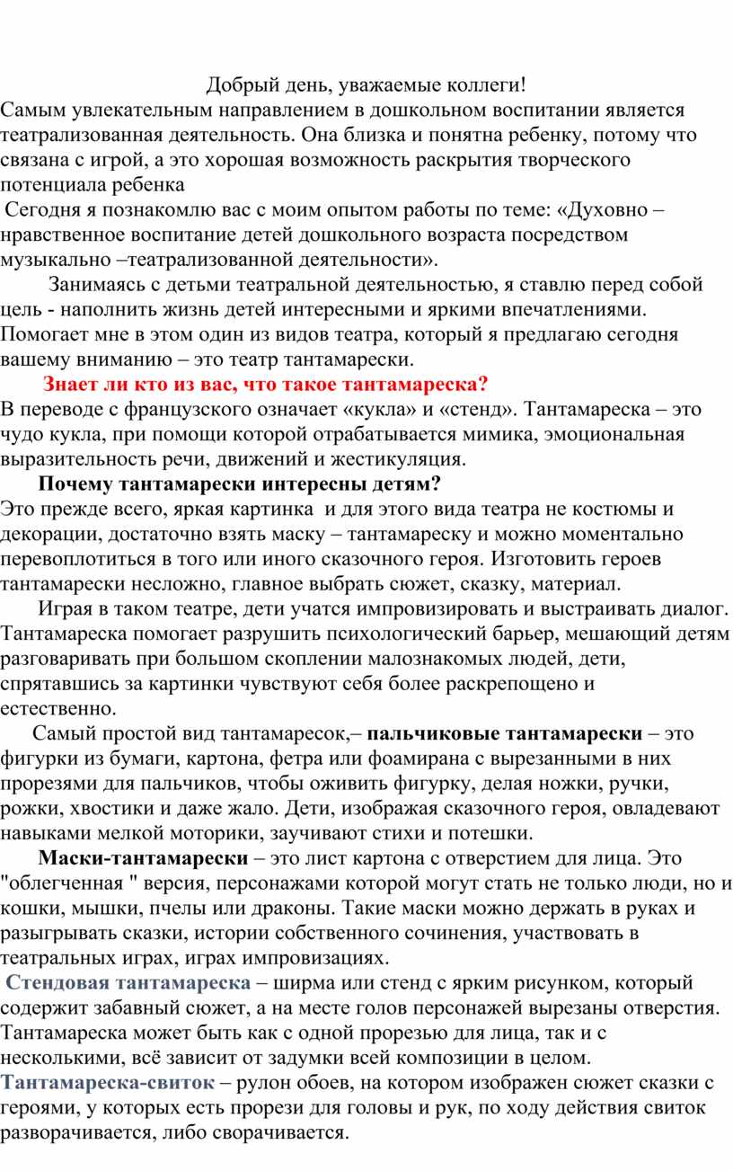 Занимаясь с детьми театральной деятельностью, я ставлю перед собой цель - наполнить жизнь детей интересными и яркими впечатлениями. Помогает мне в этом один из видов театра, который я предлагаю сегодня вашему вниманию – это театр тантамарески.