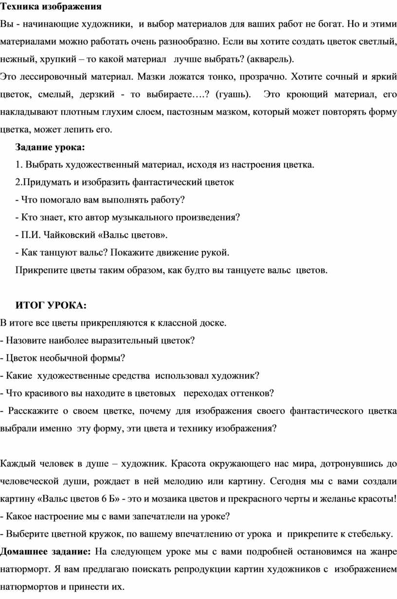 Каждый человек в душе – художник. Красота окружающего нас мира, дотронувшись до человеческой души, рождает в ней мелодию или картину. Сегодня мы с вами создали картину «Вальс цветов 6 Б» - это и мозаика цветов и прекрасного черты и желанье красоты!