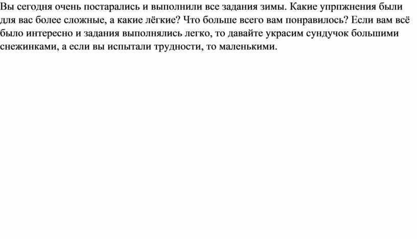 Вы сегодня очень постарались и выполнили все задания зимы. Какие упрпжнения были для вас более сложные, а какие лёгкие? Что больше всего вам понравилось? Если вам всё было интересно и задания выполнялись легко, то давайте украсим сундучок большими снежинками, а если вы испытали трудности, то маленькими.