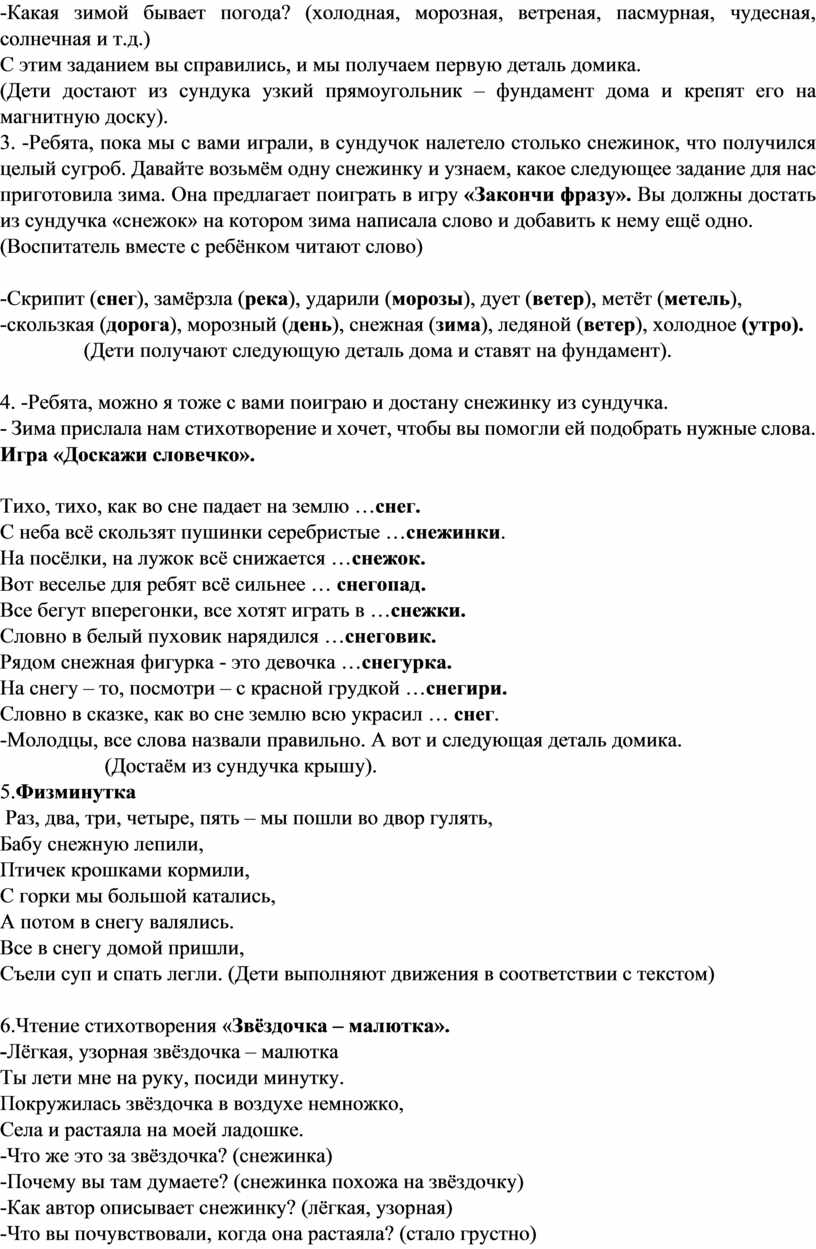 3. -Ребята, пока мы с вами играли, в сундучок налетело столько снежинок, что получился целый сугроб. Давайте возьмём одну снежинку и узнаем, какое следующее задание для нас приготовила зима. Она предлагает поиграть в игру «Закончи фразу». Вы должны достать из сундучка «снежок» на котором зима написала слово и добавить к нему ещё одно.