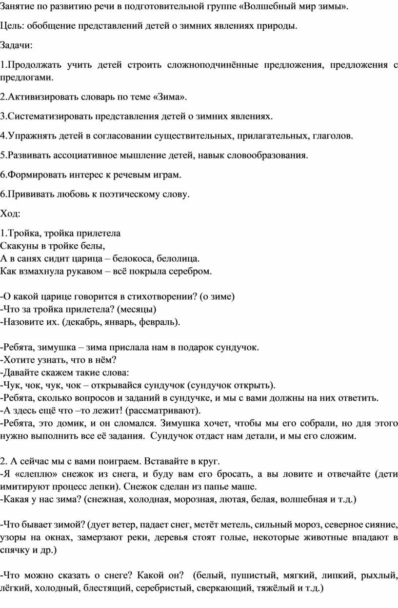 Занятие по развитию речи в подготовительной группе «Волшебный мир зимы».