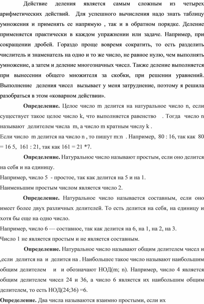 Действие деления является самым сложным из четырех арифметических действий. Для успешного вычисления надо знать таблицу умножения и применять ее напрямую , так и в обратном порядке. Деление применяется практически в каждом упражнении или задаче. Например, при сокращении дробей. Гораздо проще вовремя сократить, то есть разделить числитель и знаменатель на одно и то же число, не равное нулю, чем выполнять умножение, а затем и деление многозначных чисел. Также деление выполняется при вынесении общего множителя за скобки, при решении уравнений. Выполнение деления чисел вызывает у меня затруднение, поэтому я решила разобраться в этом «коварном действии».