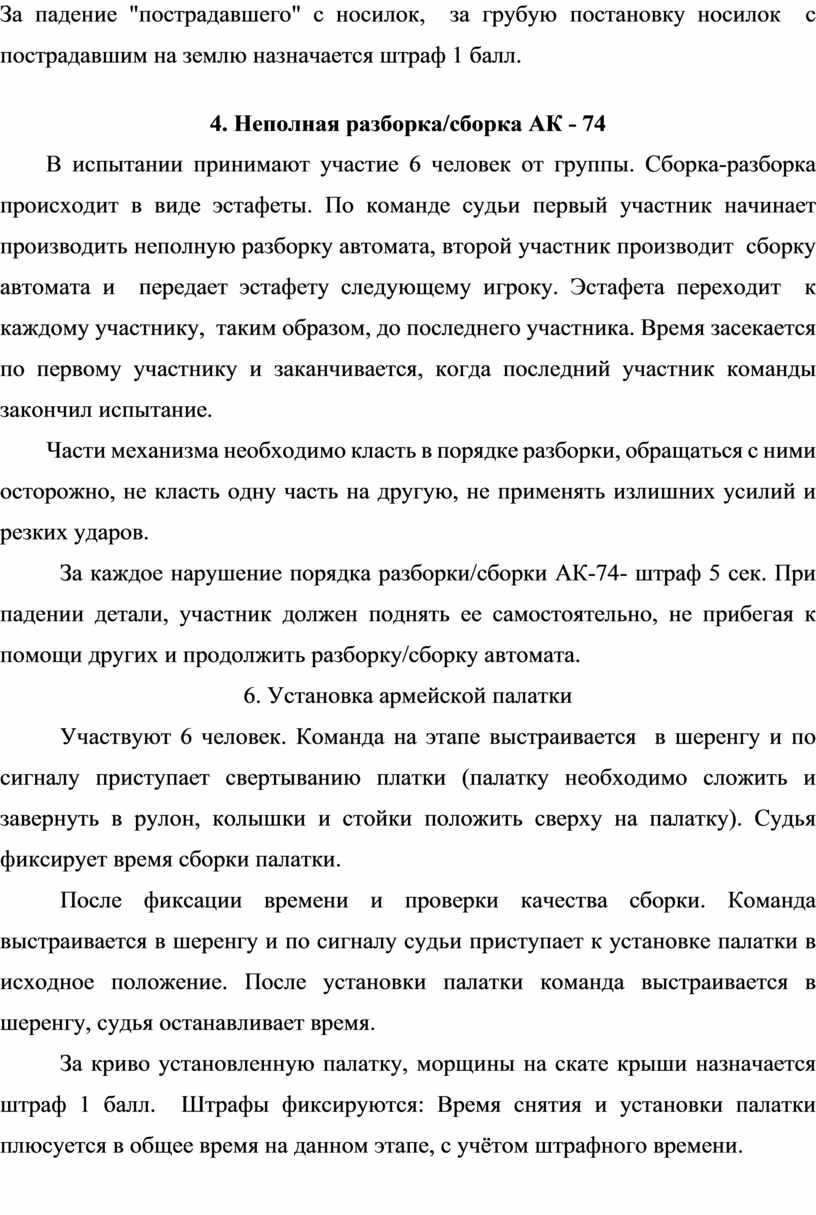 За каждое нарушение порядка разборки/сборки АК-74- штраф 5 сек. При падении детали, участник должен поднять ее самостоятельно, не прибегая к помощи других и продолжить разборку/сборку автомата.