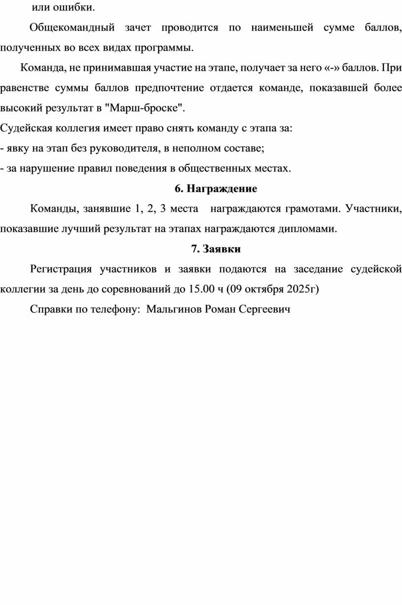 Команда, не принимавшая участие на этапе, получает за него «-» баллов. При равенстве суммы баллов предпочтение отдается команде, показавшей более высокий результат в "Марш-броске".